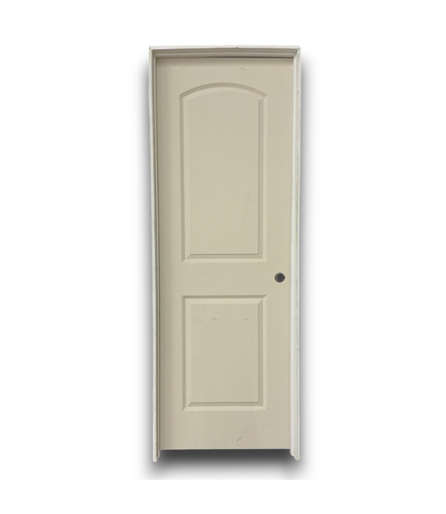 In good condition. Prehung 2 Panel Arch Top Interior Door. Hollow core. Left hand inswing. Primed ready to paint. 2 raised panel with arch top. Without frame: 27.875"W x 1.375"T x 80"H. With frame: 29.25"W x 4.5"T x 81.5"H.