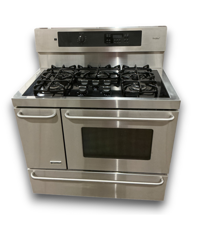Used in good condition. Kenmore Elite Stainless Steel Dual Fuel Range. Natural gas 5 cooktop burners and 220V electric for 2 ovens. Adjustable feet levelers. Dimensions: 40"W x 25.1875"D x 36" and 48"H.