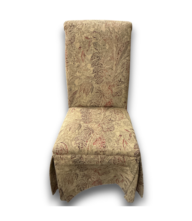 Good condition used. Skirted Parsons Dining Chairs With Rolled Top (Set of 4). Paisley pattern with gold/autumn colors. Buttoned back. Dimensions: 20"W x 21"D x 41"H.
