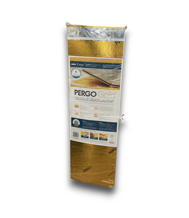 Good condition in package. Pergo GOLD premium foam underlayment. Fan fold type. Cushioning. Sound absorbing. Vapor barrier. Mold & mildew resistant. Dimensions: 4'W x 25'L. Thickness: 3-mm. Coverage area: 100 sq. ft.