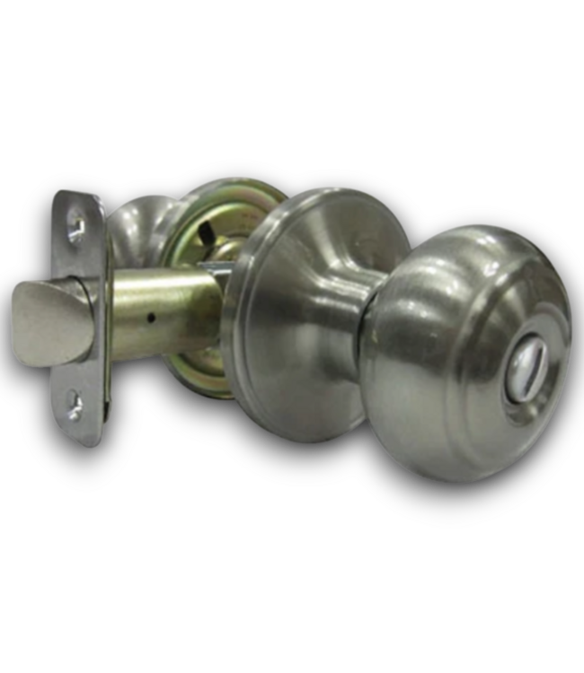 Good condition in box. TruGuard Verona fancy mushroom privacy knob set. Satin nickel color. Turn button lock. Adjustable backset 2-3/8" to 2-3/4". Fits doors 1-3/8". to 1-3/4". Easy to install.