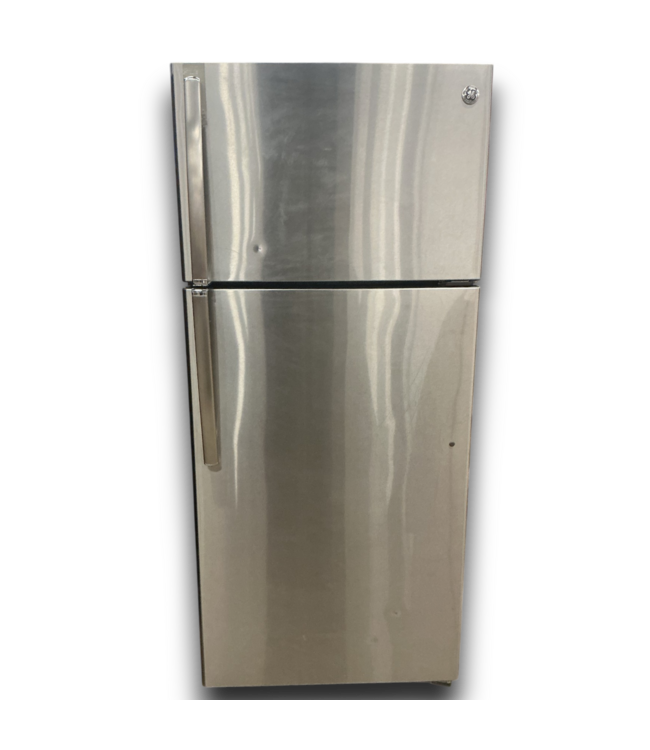 Used in good condition. GE Stainless Steel Top Freezer Refrigerator. Contoured door style. Smooth. 2 door shelves, gallon. 2 humidity controlled crispers. Reversible door. Adjustable spill proof glass shelves. Dimensions: 28"W x 29.5"D with door x 64.25"H