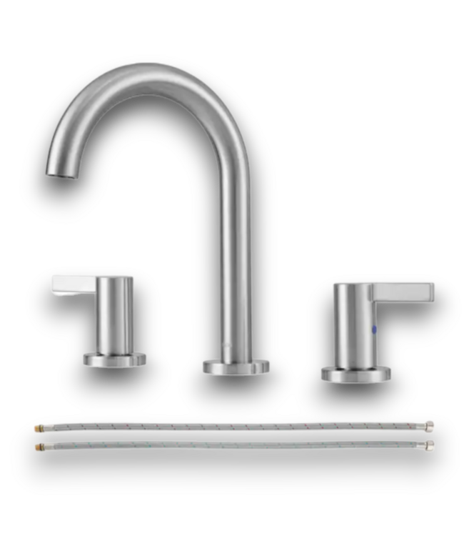 Good condition in box. Parlos Electra Brushed Nickel Widespread Bathroom Sink Faucet. 2 handle faucet. Ceramic disc valve. High arc. Residential. Supply lines included. Deck mount. Dimensions: 8.97" max faucet height.