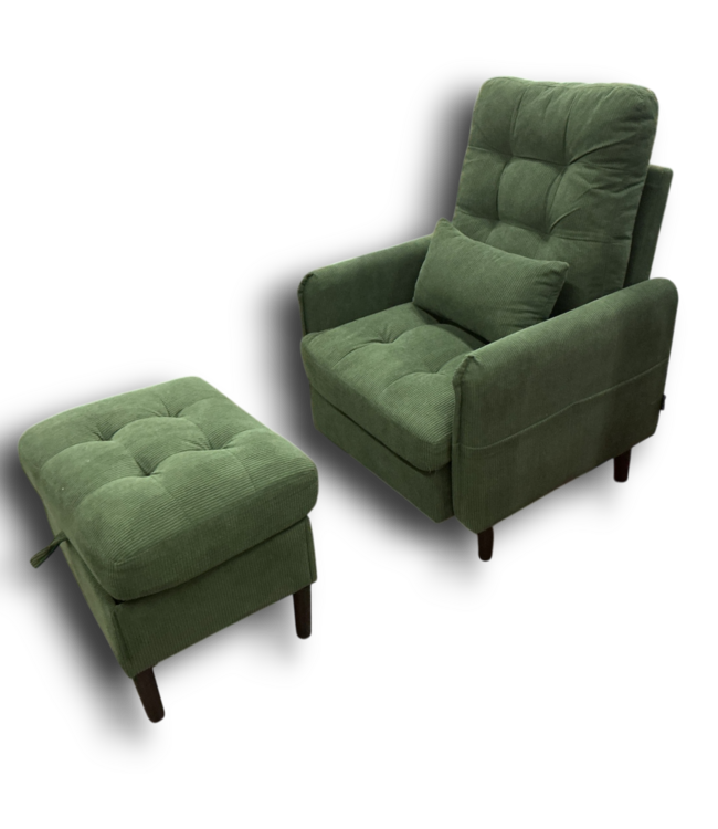 In good condition, fully assembled. Dreamsidea Green Accent Reclining Chair With Storage Ottoman. Corduroy upholstered. Rectangle pillow included. 3 stage adjust backrest from 110°to 180°. Chair: 29"W x 28"D x 18"H seat. Ottoman: 22"W x 16"D x 18"H.