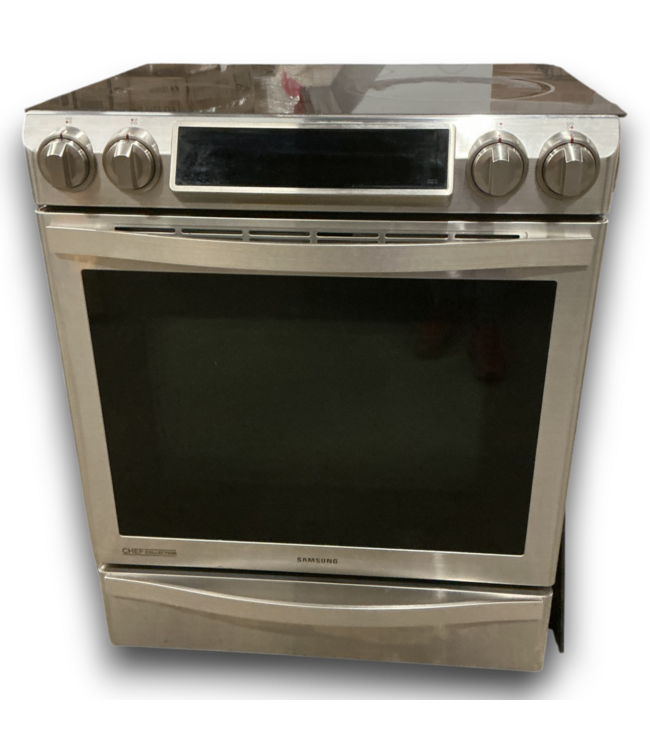 Used in good condition. Samsung Chef Collection 30" Slide-In Induction Range. Flex Duo cook dishes at different temps, dual convection, virtual flame. Side panel needs to be reattached in front, see photos. Dimensions: 29.81"W x 26.3125"D x 36.125"H