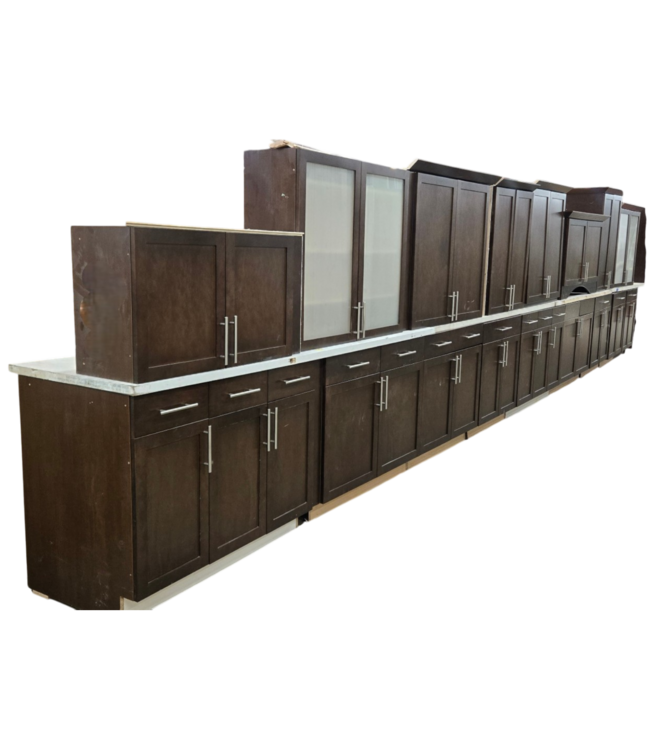 Fully functional cabinet set with brushed nickel hardware, side trim, and crown/brickmould accents. Select cabinets feature frosted glass panels. Includes sink base and pantry. See photos for sizes.