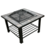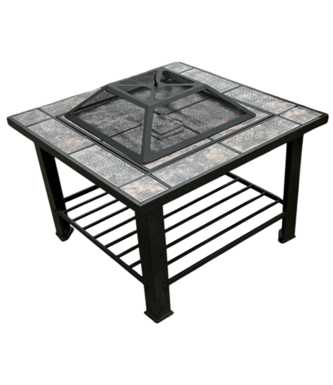 Good condition. Square Steel Fire Pit and Table with Cover pre-assembled. Out of box. Sturdy. Made from powder-coated steel. Resistant to rust. Cover, screen, extra tiles and log poker included. Dimensions 30"W x 26"H 30"D.
