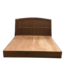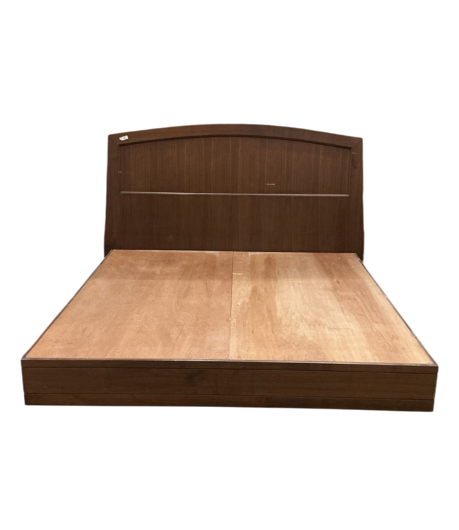 Used in good condition. Teak color. Solid wood. Handcrafted. Platform style. Arched top headboard. Dimensions: 80"W x 83"L x 10"H. Headboard: 47.5"H.