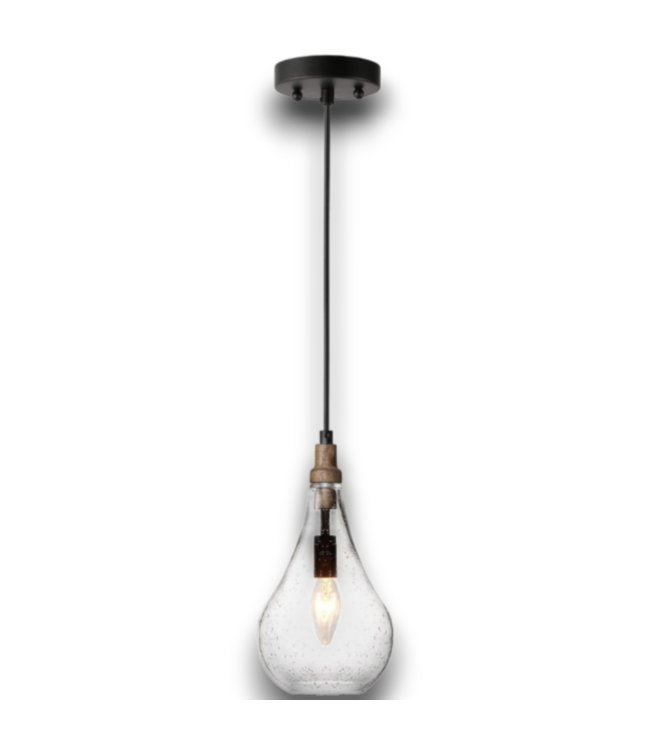 Good condition in box. GEPOW collection. Farmhouse style. NAtural wood color. Seeded glass teardrop shade. Dimmable. Hardwired. Mounting hardware included. Dimensions: 5.9"W x 5.9"L x 11.8"H. Adjustable hanging height: 16" - 74".