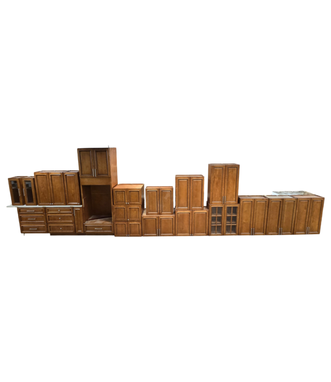 Pre-owned cabinet set in caramel stain with dovetail construction, magnetic latch doors, and brushed nickel hardware. To view specs & dimensions*see photos.