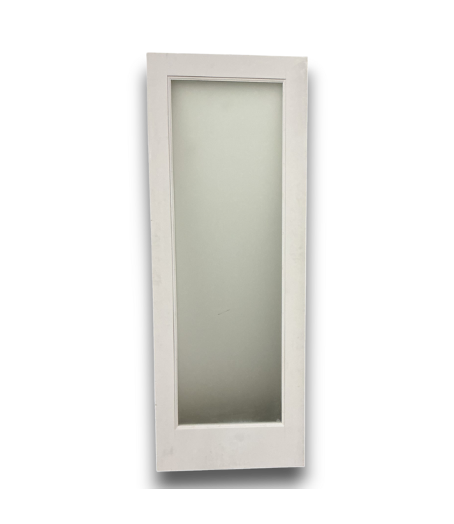 Used in good condition. Left hand inswing. Primed white color. Frosted glass. Full-lite. No handle. Dimensions: 29.75"W x 1.375"T x 80"H.