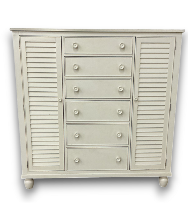 Used in good condition. Off-White Nantucket Chifferobe Cottage Armoire. 6 dovetail drawers, 2 shutter style louver doors one door is hard to open and close and has a crack on outside, see photos, 2 adjustable shelves. Dimensions: 62"W x 19"D x 62"H.