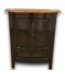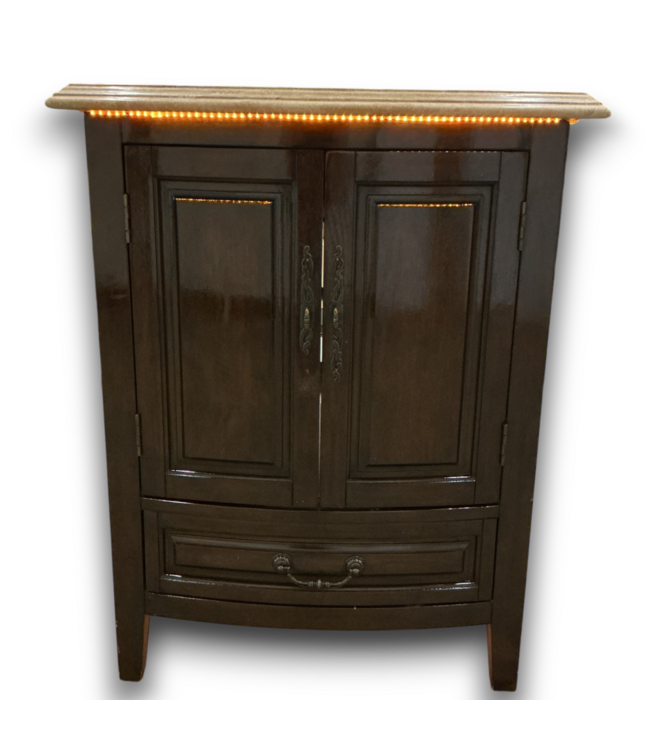 Ivory ceramic undermount sink. 2 doors, 1 drawer. Antique brass hardware. Plug in light strip under top and light switch on interior.