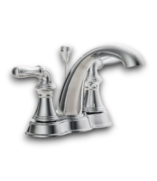 Good condition. Still in box. Devonshire polished chrome 4" centerset 2-handle WaterSense Low-arc Commercial/Residential Handle Bathroom Sink Faucet with Drain with Deck Plate. Premium material. Exceeds industry durability standards 2 times.