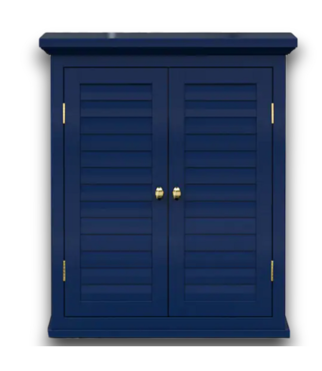 Good condition in box. Teamson Home Navy Bathroom Wall Cabinet. Rustic. Door overlay. 2 doors, 1 adjustable shelf. Mounting hardware included. louvered doors.Brushed gold hardware. Assembled Dimensions: 20.08"W x 7.01"D x 24.02"H.