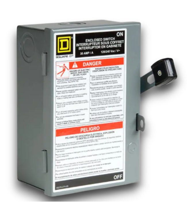 Good condition. Inbox. The Square D by Schneider Electric 30 AMP Single Phase (120V/240V) Fusible Indoor Light-duty Safety Switch Disconnect. Good for residential and agricultural. Reliable, safe, and easy installation.
