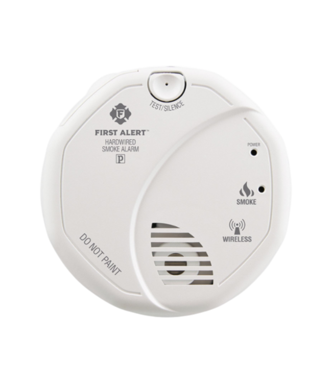 Good condition in box. First alert wireless interconnect hardwired smoke alarm. White color. Battery backup two AA. Smart sensing technology. Dimensions: 5"W x 5"L x 2"D.
