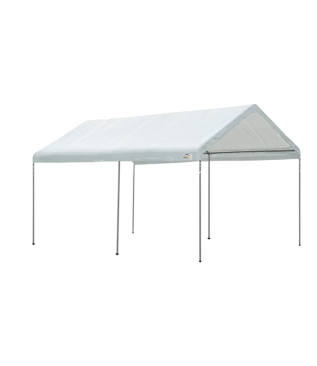 Good condition in box. Shelterlogic Max AP series. Assembly required. Heavy duty steel frame gray color. White canopy color. Durable ripstop tough triple layer woven fabric. UV resistant. Dimensions: 10' x 20'L x 9.5'H. Read more.