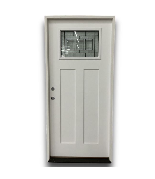 Good condition like new. Prehung White Fiberglass Exterior Door. RH inswing. Two panel embossment and 1 glass panel with geometric design with beveled edges. Double bore. Black hinges & threshold. Dimensions: 36"W x 1.75"D x 80"H.