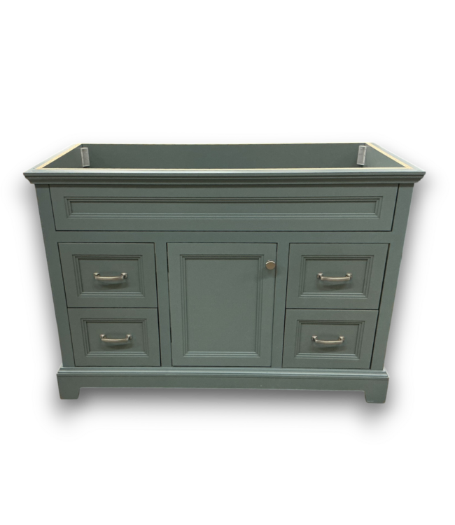 In good condition, unboxed in store fully assembled. Style Selections Merrill Light Jade Bathroom Vanity Without Top. Brushed nickel decorative hardware. Freestanding. Inset door overlay. Dimensions: 48"W x 21.57"D x 34"H.