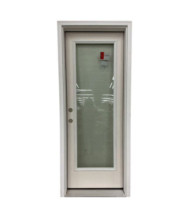 In good condition. Therma-Tru Full Lite Right Hand Prehung Exterior Door. Brick Moulding. Primed. Low-E Insulated tempered glass. Right hand inswing. Aluminum threshold. Without frame: 29.875"W x 1.75"T x 79"H. With frame: 31.25"W x 6.5"T x 81.5"H.