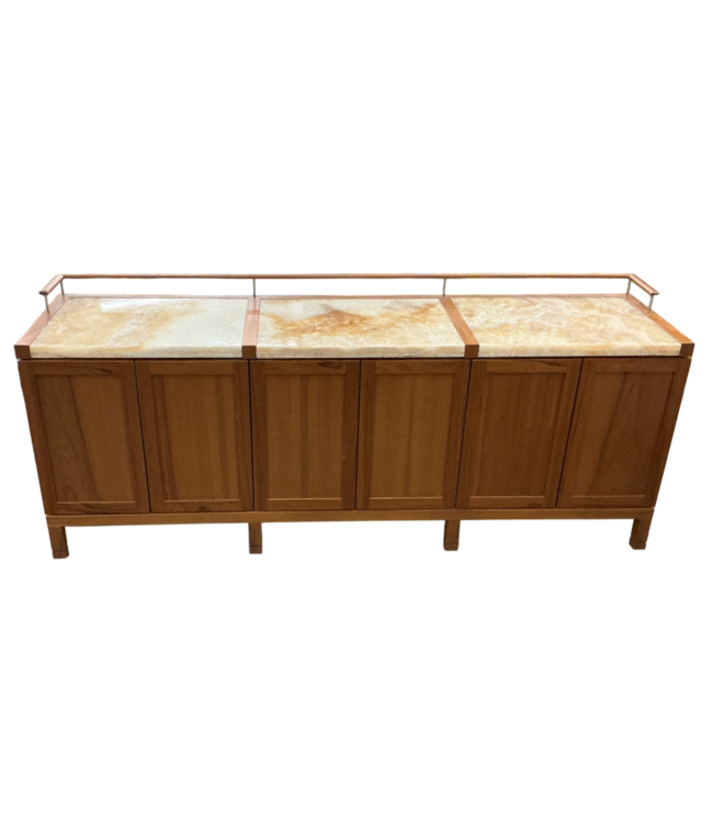 Used in good condition. Cleaner look than bar carts, hidden storage keeps things tidy. 6-magnetic latch doors. 6-slide out shelves. 2-interior shelves. Teak finish color. Amber onyx stone top. Dimensions: 72"W x 18"D x 27"H.