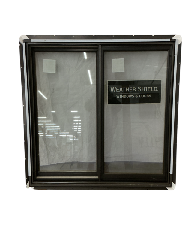 Good condition. Weather shield horizontal slider window. Black aluminum exterior. Wood interior. Screen included, does have a tear. Dimensions: 47.5"W x 46.5"H.