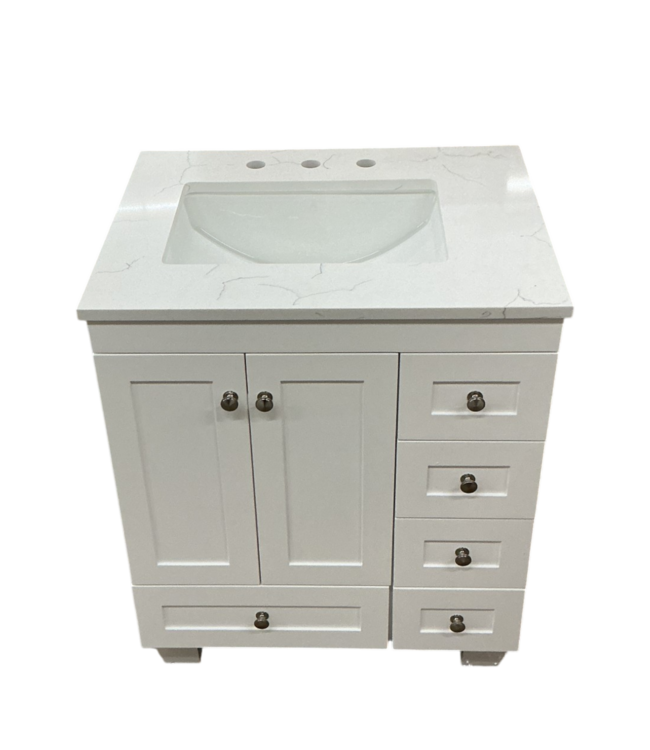 Good condition out the box. Eviva series. Fully assembled. White Carrara quartz top. Undermount white porcelain sink, 8-in widespread holes. Soft close. 2-doors. 5-pullout drawers. Brushed nickel hardware. Open back. Dimensions: 28"W x 22"D x 33.75"H.