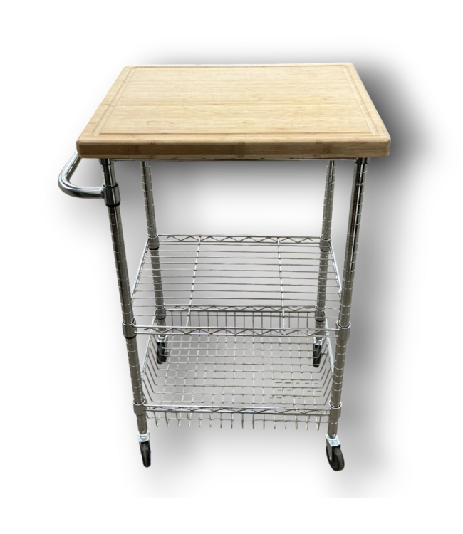 Good condition. Removable Bamboo top. Adjustable chrome wire shelves. 4-wheels, two lockable to stay in place. Dimensions: 19.5"W x 24"L x 40"H.