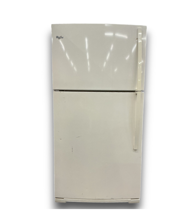 Used in good condition. Whirlpool Bisque Top Freezer Refrigerator. Removable spill proof glass shelves, humidity control crispers, adjustable gallon door bins and condiment caddy. Freestanding. Reversible door. 120 volts. Dimensions: 32.5"W x 34"D x 66.25