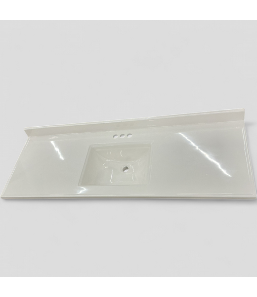In good condition. Design House Camilla Cultured Marble Top. Solid white. Single sink. 4" centerset faucet mount. Bathroom vanity top. Integrated sink, backsplash. Half round edge profile. Rectangle sink shape. Dimensions: 61"W x 22"D x 7"D sink.
